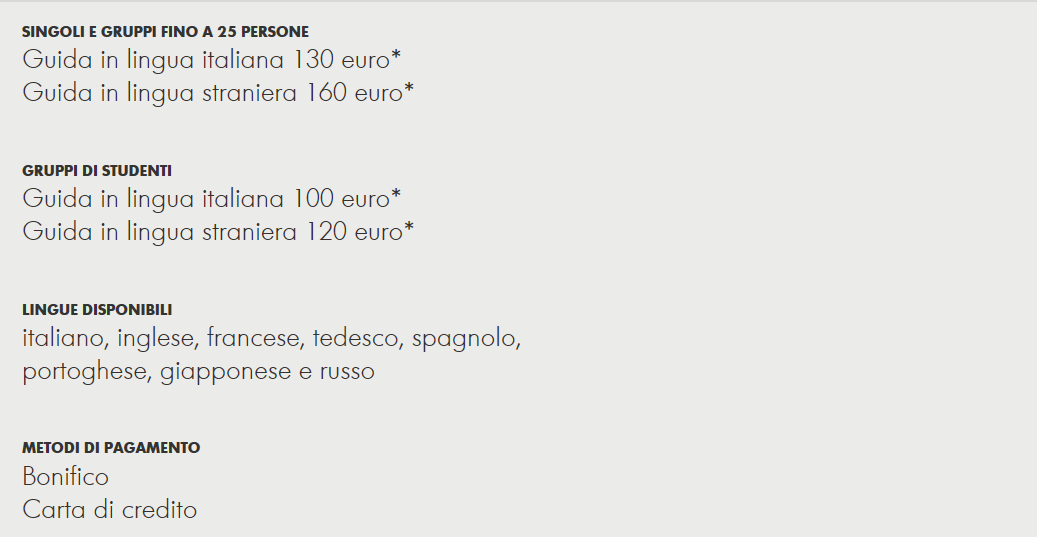 Бронирование экскурсионного обслуживания для групп: предварительный заказ за 5 рабочих дней для русскоязычных групп телефон: +39 02 91630010 с 9.00 до 18.30; e-mail guidedtours@armanisilos.com
