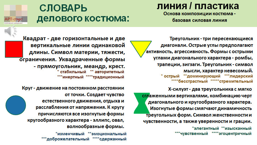 Вертикальные линии символизируют целеустремленность, стремление к развитию и успеху. Кроме того, они делают фигуру выше и стройней. Горизонтальные линии визуально расширяют, создают ощущение стабильности, спокойствия, уравновешенности. Наклонные линии добавляют динамики, причем, чем резче наклон и выше, чище, вытянутей линия, тем больше экспрессии сообщается костюму.