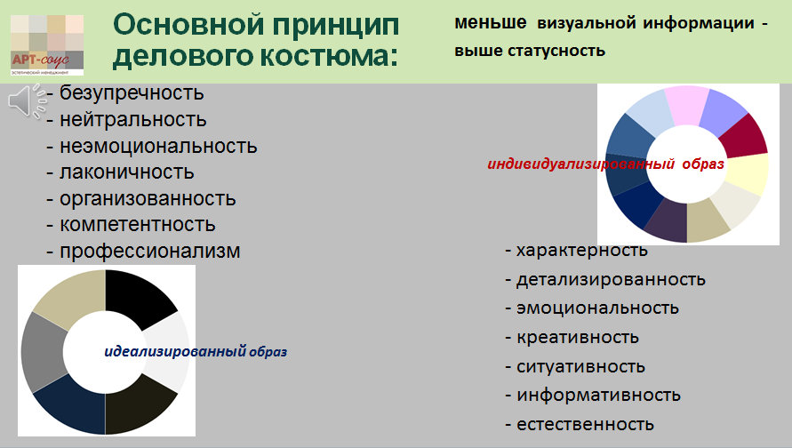 Согласно общему правилу, повышение статусности костюма предполагает отказ от индивидуализированных, детализированных, харАктерных особенностей в сторону большей строгости, лаконичности, безупречности форм. Индивидуализированный образ, гармоничный для делового общения на уровне креативных видов деятельности, не подходит для компаний с высоким уровнем консервативности. Высокая информативность композиции костюма проявляется в разнообразии линий, фактур, цветовых сочетаний, создавая возможность для более экспрессивной, эмоциональной самоподачи личности.